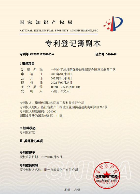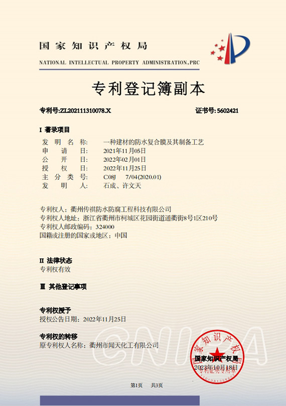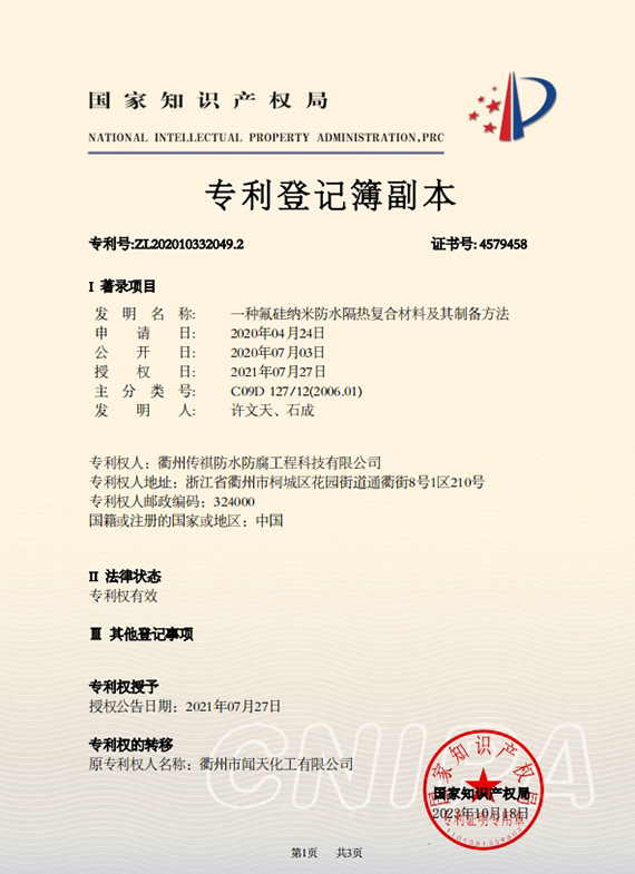衢州傳祺新材料科技有限公司是衢州市聞天化工有限公司的下屬企業(yè);衢州市聞天化工有限公司成立于2003年,是國(guó)內(nèi)最早研發(fā)、生產(chǎn)氟碳涂料的企業(yè)之一。衢州傳祺新材料科技有限公司成立于2017年,公司專注于高分子氟材料的開(kāi)發(fā)和含氟材料在防腐、防水領(lǐng)域的應(yīng)用。經(jīng)過(guò)6年的不懈努力,已獲得了化工和建筑領(lǐng)域六項(xiàng)國(guó)家發(fā)明專利授權(quán)和兩項(xiàng)新產(chǎn)品科技成果獎(jiǎng),參與了中國(guó)建筑材料流通協(xié)會(huì)《房屋修繕?lè)浪こ桃?guī)范》標(biāo)準(zhǔn)的編制工作,中建協(xié)涂裝委員會(huì)浙西工作站設(shè)立在我公司。